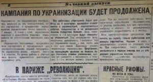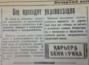 “Сьогодні почалось нове життя! Здається, нарешті влада остаточно почула нас та пішла на поступки нашим національним ідеям! Надворі 1925 рік, вже 5 років, як триває політика українізації на нашій любій Землі… А сьогодні, цей день, 4 вересня 1925 року, вій ввійде в історію: сьогодні прийняли закон про українізацію преси! Чекайте, чекайте всі, та за хвилю з усіх боків полине наша рідна, співуча українська мова! Громом загрімить журлива пісенька Шевченка на кожні вуличці наших містечок та найвіддаленіших сіл! Чи не цього ми всі чекали? Що ж може бути кращим для підкріплення національного духу?1 отже, не дарма боролись, не дарма протистояли узурпаторській владі! Нас почули! Ми на дорозі до перемоги!